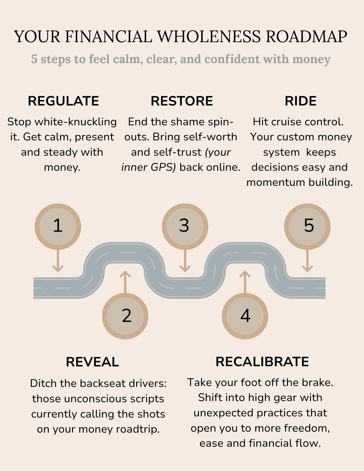The Whole Money Method™ moves through five stages. The illustration below shows you the terrain, but don't let the numbers fool you. The stages weave into each other, and the work deepens as you do.